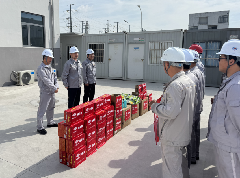 在榮盛金塘新材料項目,張勇、胥正旺向奮戰(zhàn)在高溫一線的員工送去鹽汽水、王老吉、防暑藥品等慰問品,致以殷切問候并感謝他們在烈日下的堅守。在項目現(xiàn)場,張勇仔細查看工程進展與安全生產(chǎn)情況,肯定項目取得的工作成效,強調(diào)要科學(xué)調(diào)整作業(yè)時間、落實防暑預(yù)案,確保實現(xiàn)“零中暑、零事故”;叮囑員工增強防護意識、勞逸結(jié)合,以飽滿的精神狀態(tài)打贏高溫攻堅戰(zhàn)。